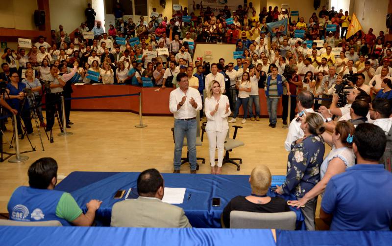 Sin embargo, cerca de las 10:30 el primer candidato para esa dignidad en inscribirse fue Carlos Luis Morales por el Partido Social Cristiano (PSC) y Madera de Guerrero (MG), junto con Susana González como aspirante a viceprefecta.