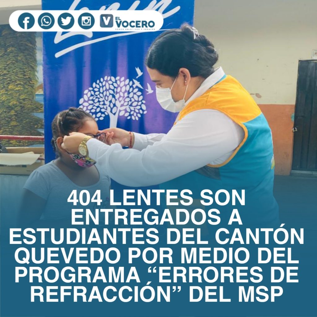 El Ministerio de Salud Pública (MSP), a través de la Dirección Distrital de Quevedo y como parte del Plan Visión, entregó 404 lentes a estudiantes de las Unidades Educativas del cantón como: Nicolás Infantes Díaz “Replica”, 7 de octubre, Manuel de Jesús Calle, José Rodríguez La bandera, Ciudad de Quevedo, Manuel Quintana Miranda y Héctor Burbano.