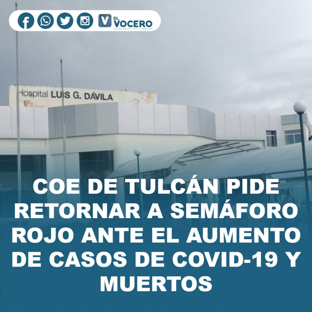 Frente al crecimiento de casos COVID-19 y al incremento de víctimas mortales por el virus en Tulcán, provincia de Carchi, el Comité Cantonal de Operaciones de Emergencia (COE cantonal) que se reunió este lunes pidió volver al semáforo rojo que regía en Ecuador durante los meses más críticos de la pandemia, en 2020.