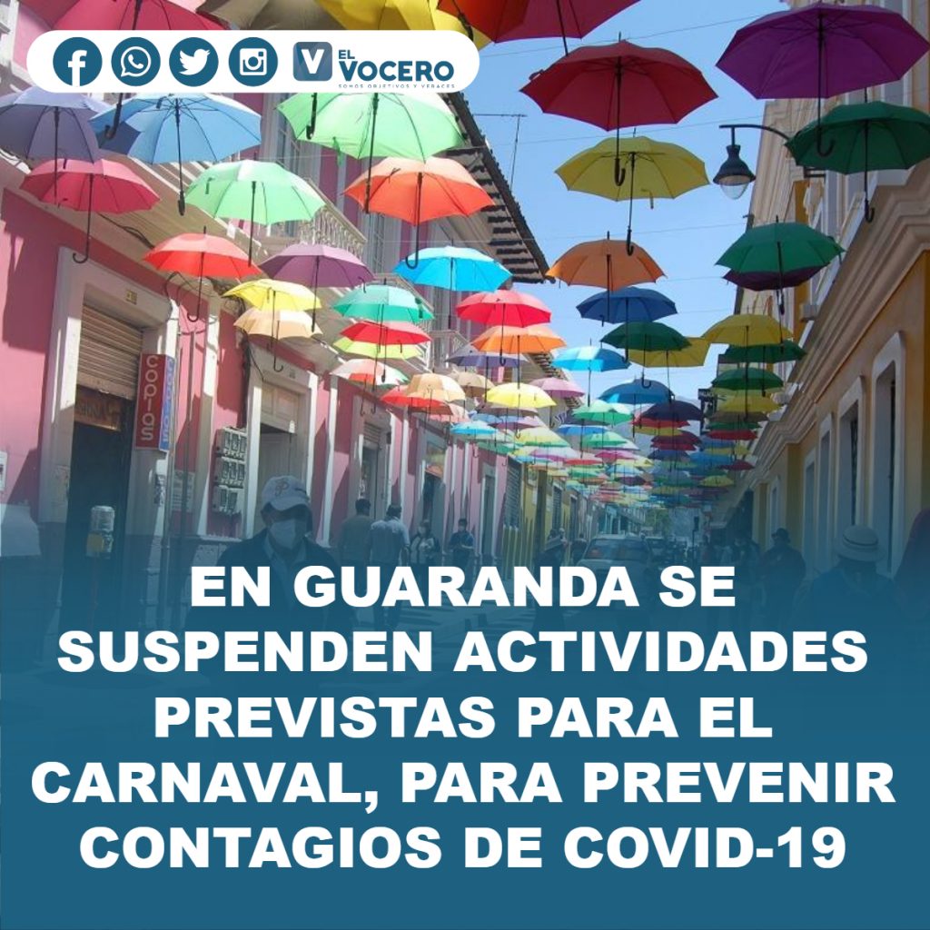 Al igual que sucedió con diferentes celebraciones tradicionales que por la pandemia del COVID-19 no se desarrollaron, en Guaranda el alcalde Medardo Chimbolema anunció que las 30 actividades culturales planificadas para el carnaval, con un presupuesto de $ 71.000, se suspenderán.