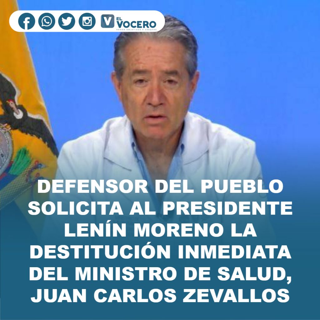 El defensor del Pueblo, Freddy Carrión, solicitó al presidente de la República, Lenín Moreno, la destitución inmediata del ministro de Salud, Juan Carlos Zevallos, por «conflicto de intereses y falta de transparencia» en la gestión pública respecto a la distribución y entrega de la vacuna contra el COVID-19.