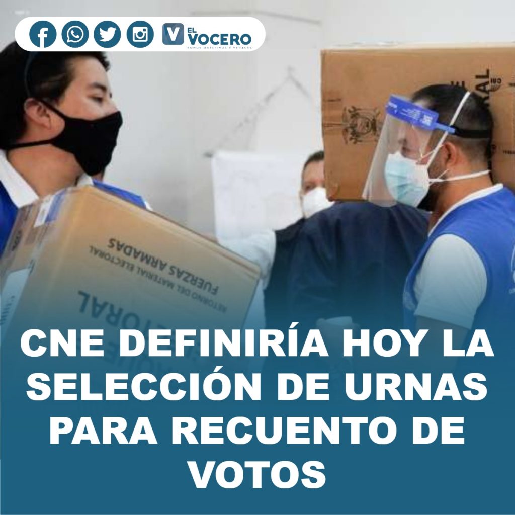 El tiempo corre y el Pleno del Consejo Nacional Electoral (CNE) debe definir la metodología con la que se seleccionarán el 50% de las juntas receptoras del voto de 16 provincias (Azuay, Bolívar, Cañar, Cotopaxi, Chimborazo, El Oro, Esmeraldas, Imbabura, Loja, Los Ríos, Manabí, Morona Santiago, Pichincha, Tungurahua, Santo Domingo y Santa Elena), donde se realizará el reconteo acordado, tras una reunión entre los candidatos a la segunda vuelta electoral: Yaku Pérez y Guillermo Lasso.