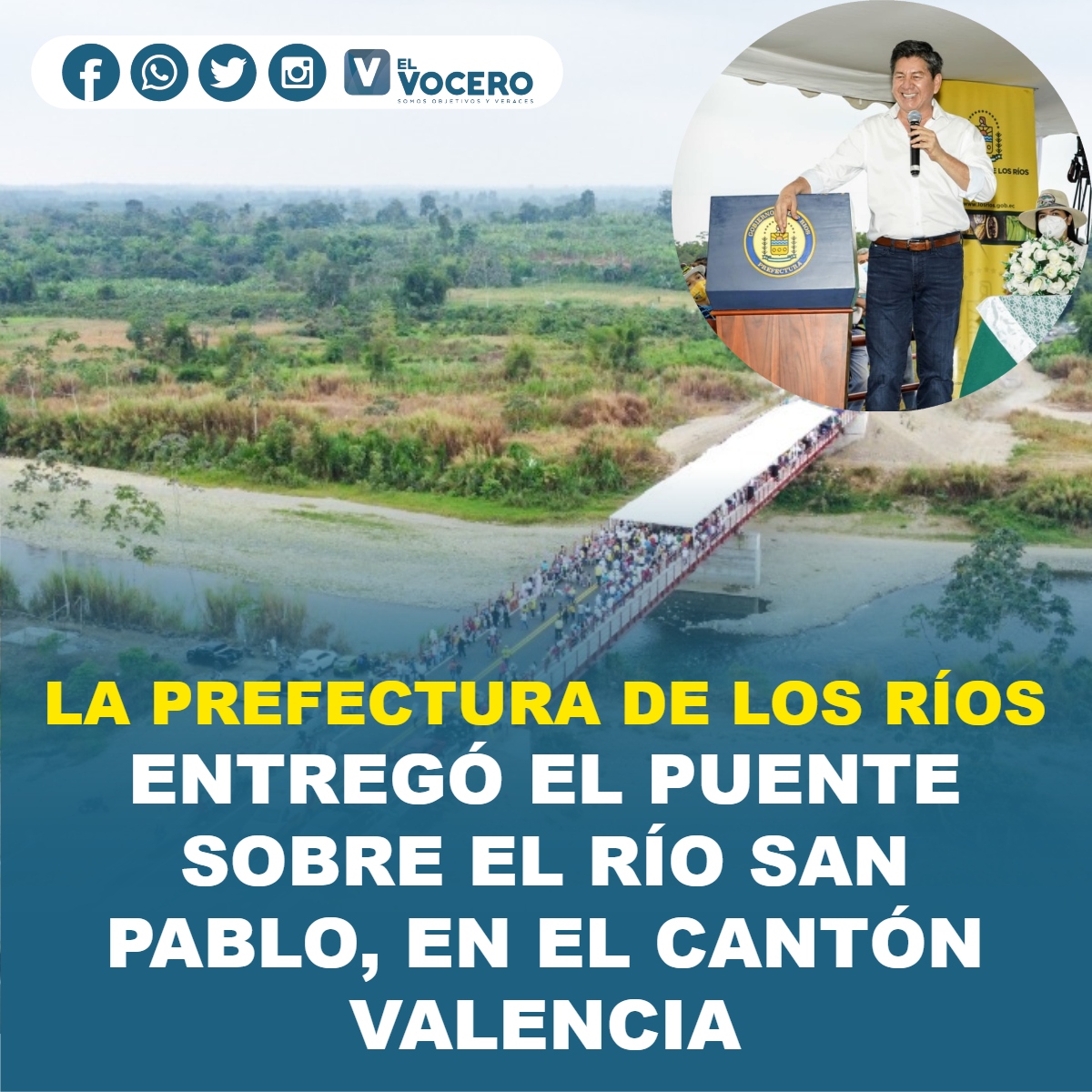 Con la presencia del señor Prefecto de Los Ríos, Johnny Terán Salcedo; el alcalde Celso Fuertes Sojos, los miembros del Concejo Cantonal, autoridades locales y provinciales; y, el gerente regional del Banco de Desarrollo del Ecuador, Mario Vásconez, se inauguró el puente sobre el río San Pablo, en el cantón Valencia.