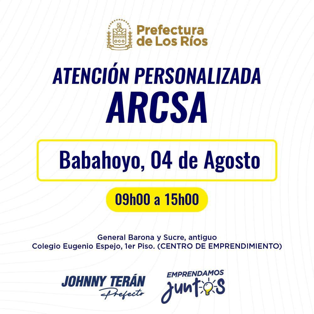 La Dirección de Gestión Empresarial, Emprendimiento e Innovación de la Prefectura de Los Ríos, en convenio con la Agencia Nacional de Regulación y Control Sanitario ARCSA, ofrecerán atención especializada con el fin de ayudar a obtener los registros, notificaciones y permisos necesarios a todos nuestros emprendedores.