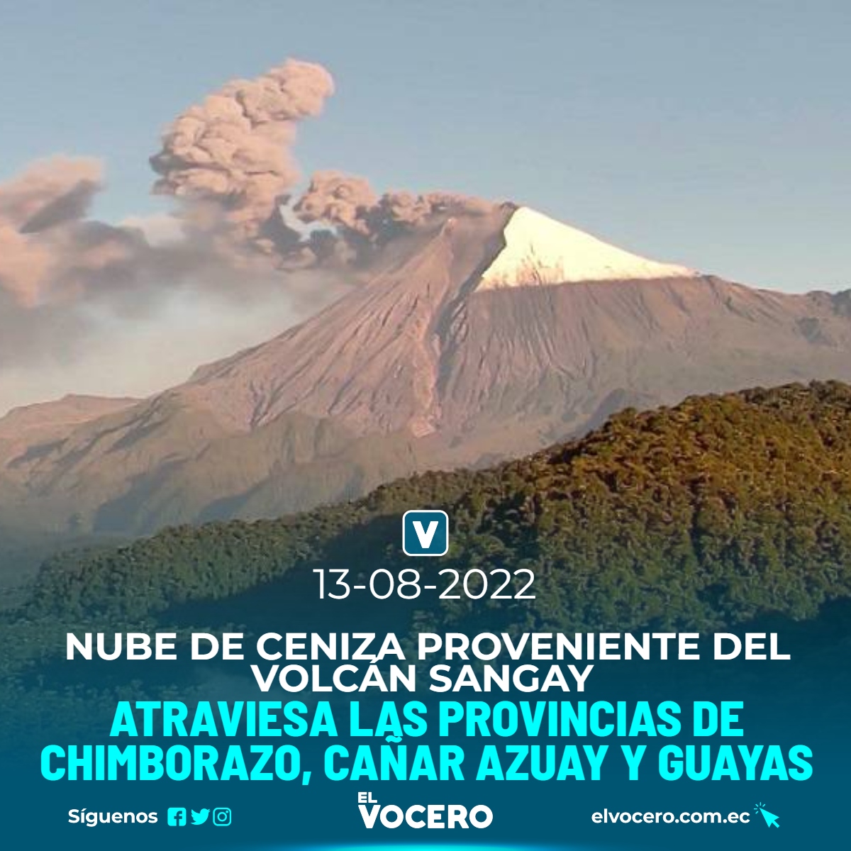 Una nube de ceniza proveniente del volcán Sangay se extiende por cuatro provincias: Chimborazo, Cañar, Azuay y Guayas, informó la mañana de este sábado el Instituto Geofísico (IG) de la Escuela Politécnica Nacional.