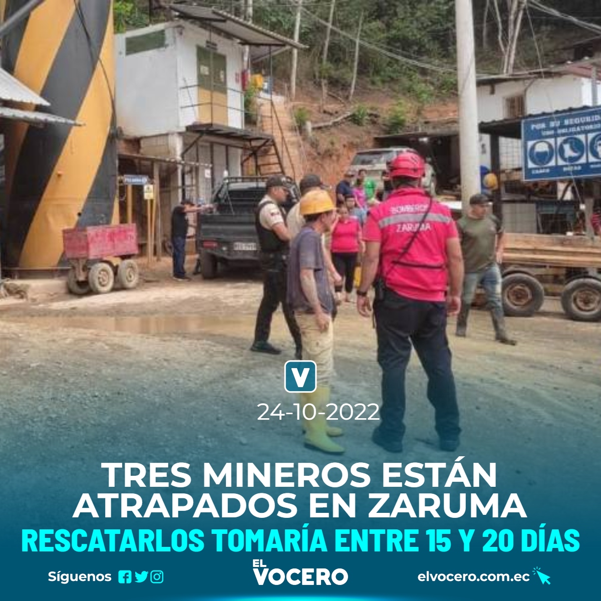 Tres trabajadores de una mina en el cantón Zaruma, provincia de El Oro, quedaron atrapados bajo tierra luego de un derrumbe. Sacarlos tomaría entre 15 y 20 días, según estimaciones de la empresa para la que laboran.