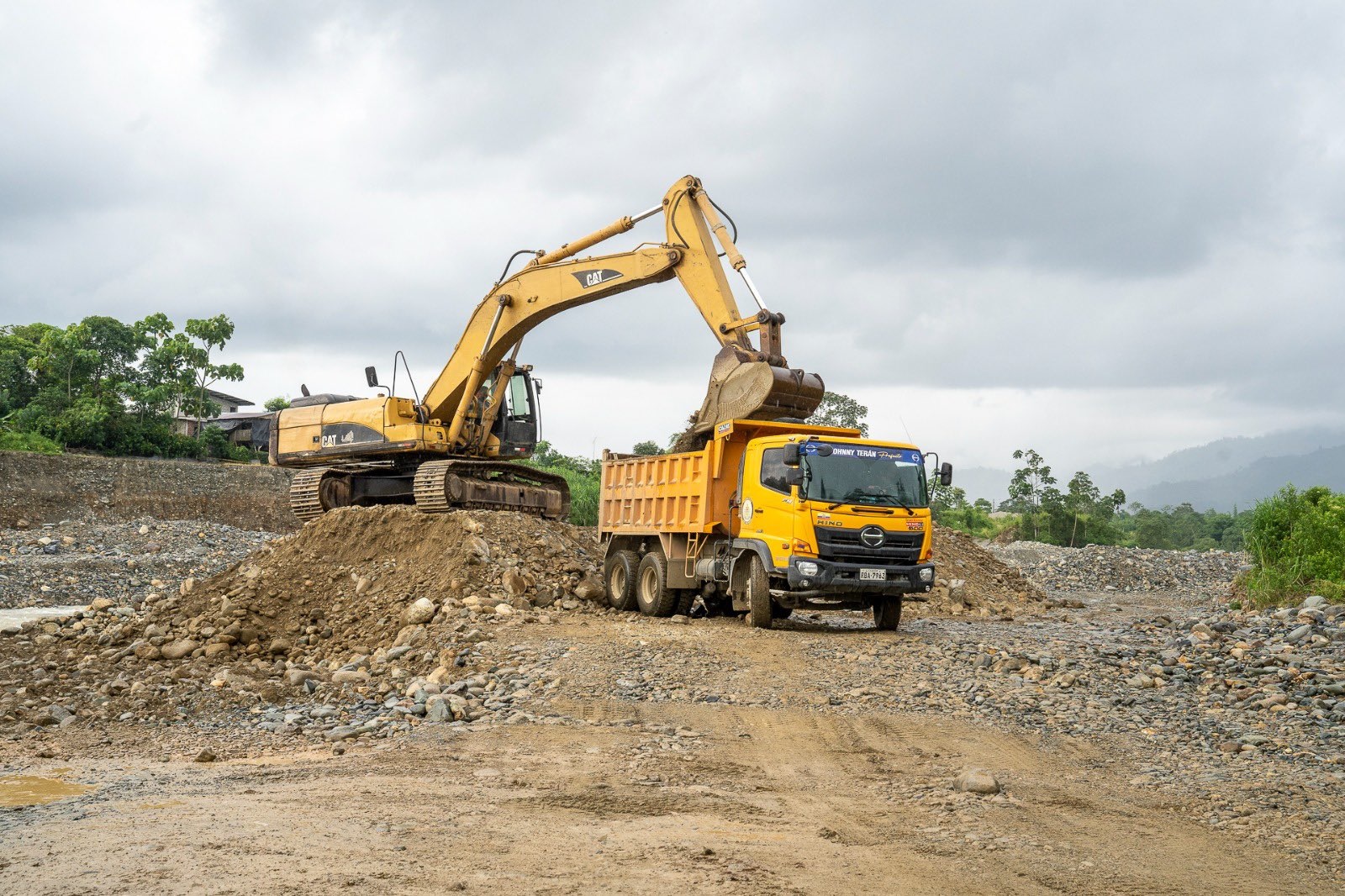 Otro frente de trabajo se encuentra laborando en la protección de la vía, levantando la estructura del muro. El material pétreo que se extrae es utilizado para proteger la carretera ante posibles desbordamientos del afluente.