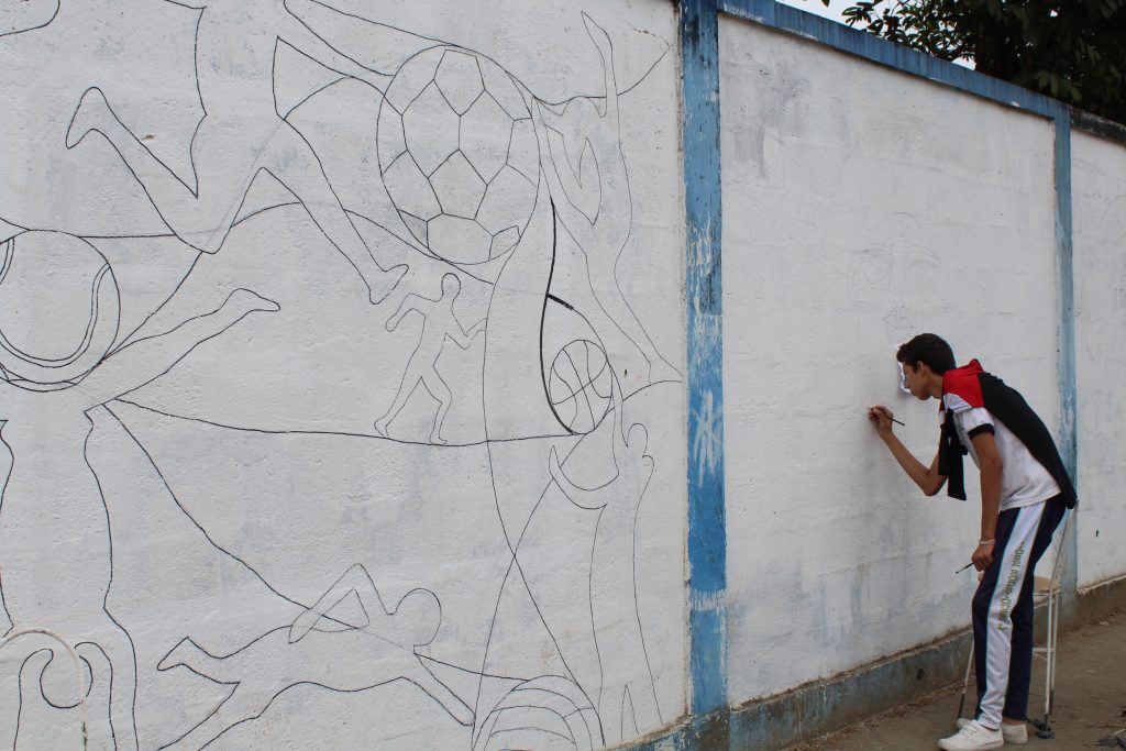 En el cerramiento de la Unidad Educativa José Rodríguez Labandera son pintados otros murales; uno con un mensaje deportivo y sobre la cultura de la ciudad, dijo Yarid Reyes Romero, estudiante de dicha institución, quien realiza esta actividad con un grupo de seis compañeros.