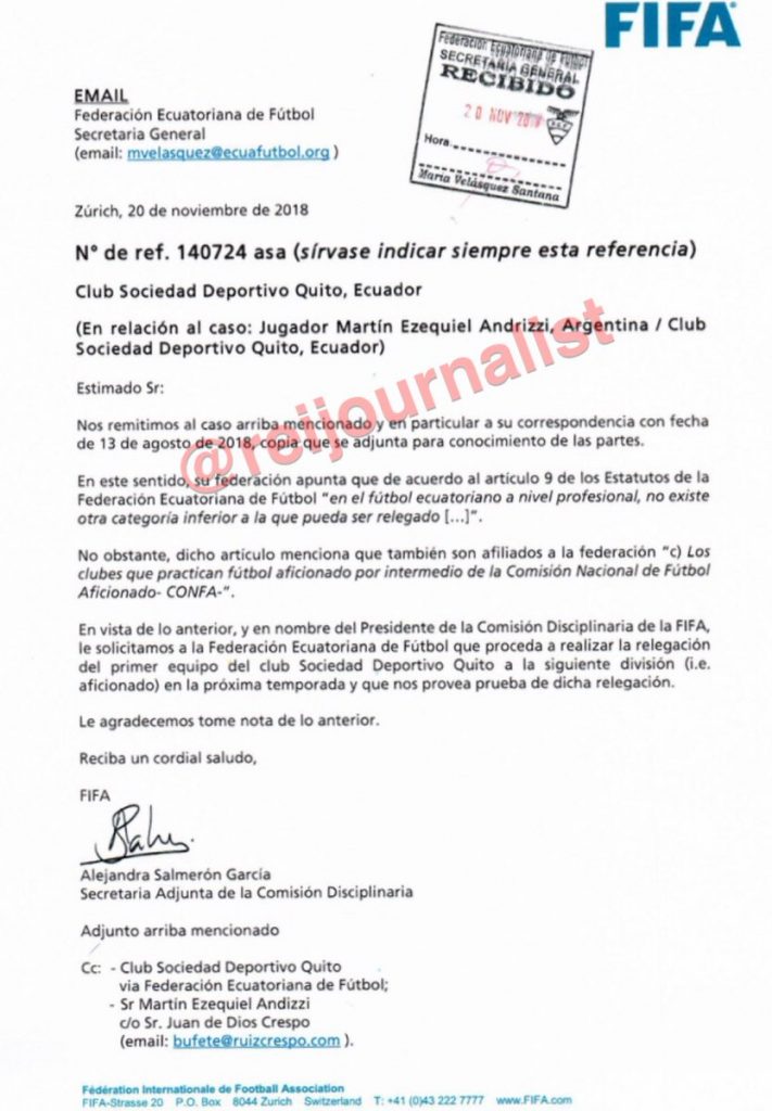 El Deportivo Quito ya es visto por la FIFA como un equipo amateur, así se dio a conocer por medio de un oficio publicado por el reconocido periodista Reinaldo Romero en su cuenta de Twitter.