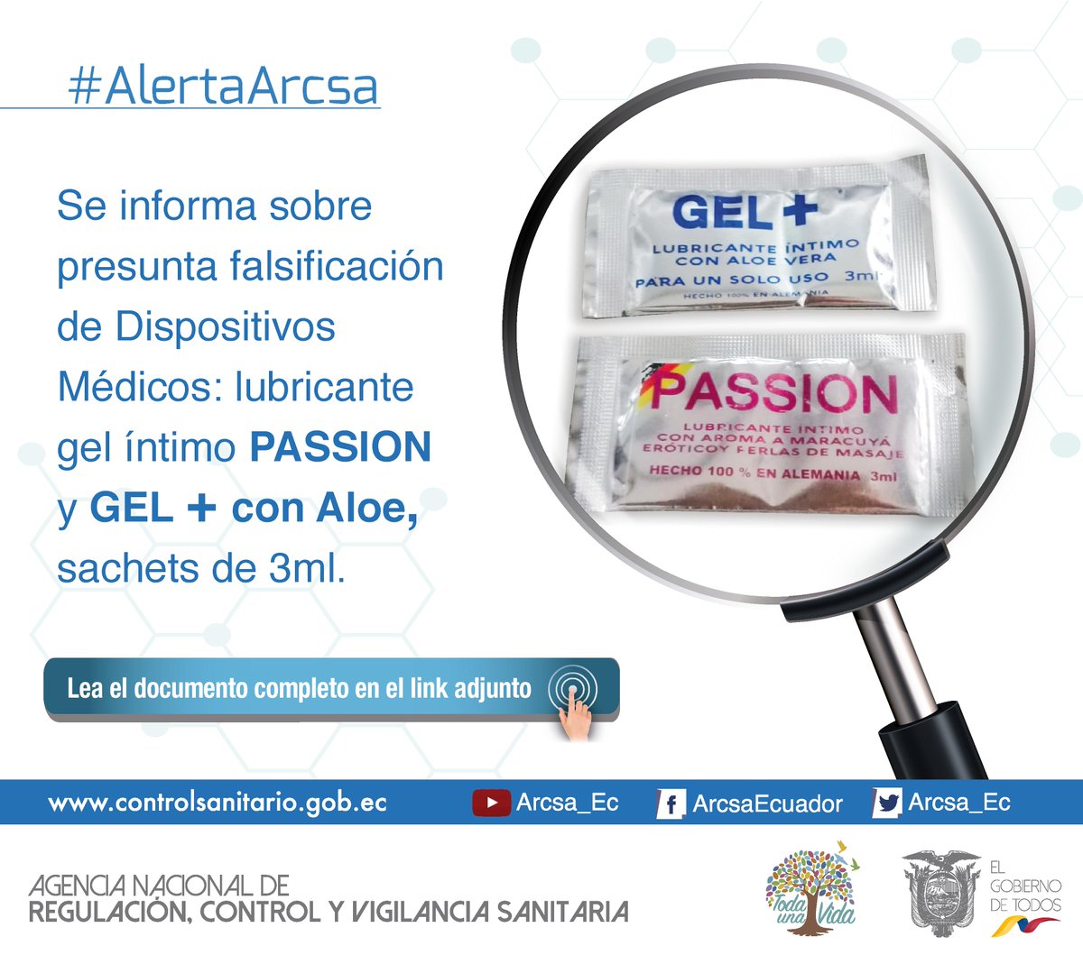 La Agencia Nacional de Regulación, Control y Vigilancia Sanitaria (Arcsa) da a conocer a la población ecuatoriana la comercialización de Dispositivos Médicos – Lubricantes de Zonas Íntimas, en presentaciones que no han sido registradas ante la Autoridad Sanitaria. En tal sentido, al ser de dudosa procedencia, no cumplen las especificaciones para garantizar su calidad, seguridad y eficacia.