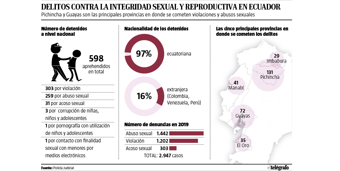 Hasta el momento, la Policía Judicial detuvo a 598 personas. Pichincha y Guayas son las principales provincias en donde se cometen estos delitos. (Ver infografía) Reformas al Código Penal Sybel Martínez, vicepresidenta del Consejo de Protección de Derechos de Quito, califica como “alarmante” que cada hora haya dos denuncias por estos delitos.
