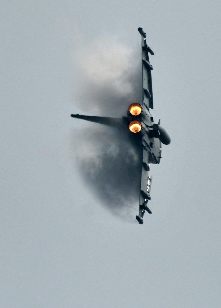 (FILES) In this file photo taken on June 15, 2019, an Eurofighter jet of the German Air Force performs during an air show to mark the Day of the German Armed Forces at the air base in Fassberg, northern Germany. - As the Bundeswehr German Armed Forces confirmed on June 24, 2019, two Eurofighters collided and crashed near Waren, northeastern Germany. (Photo by PATRIK STOLLARZ / AFP)