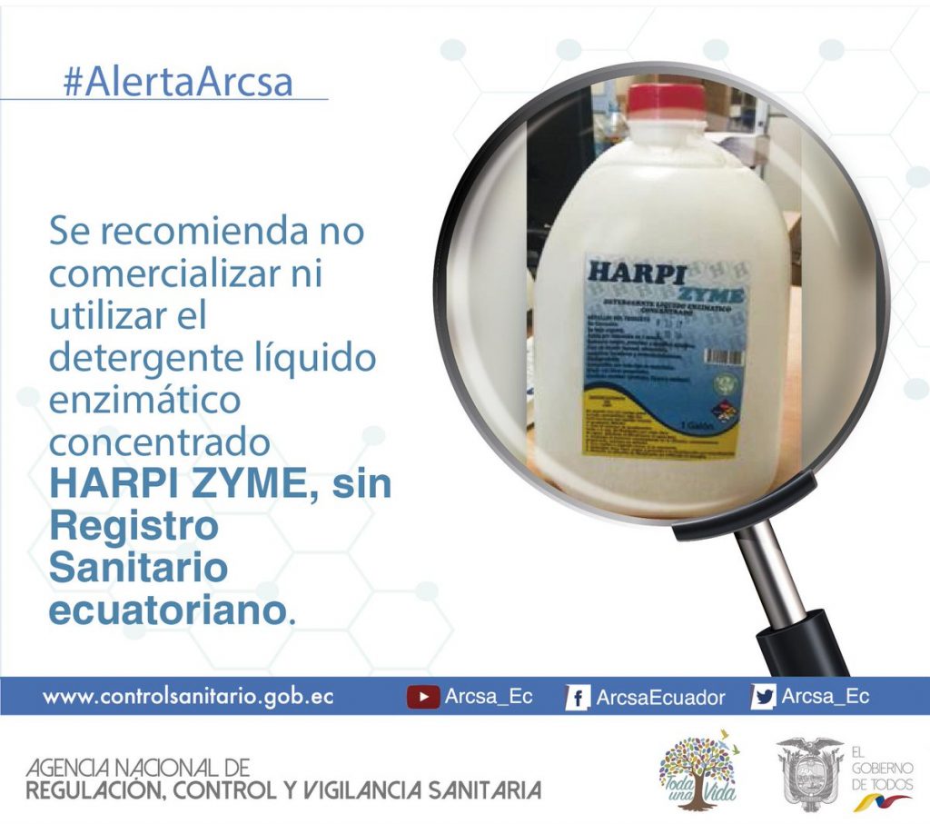 La Agencia Nacional de Regulación, Control y Vigilancia Sanitaria (Arcsa) ha tomado conocimiento del expendio en el país del producto DETERGENTE LÍQUIDO ENZIMÁTICO CONCENTRADO HARPI ZYME, del fabricante HARPICORP DEL ECUADOR, el cual no posee Registro Sanitario ecuatoriano.