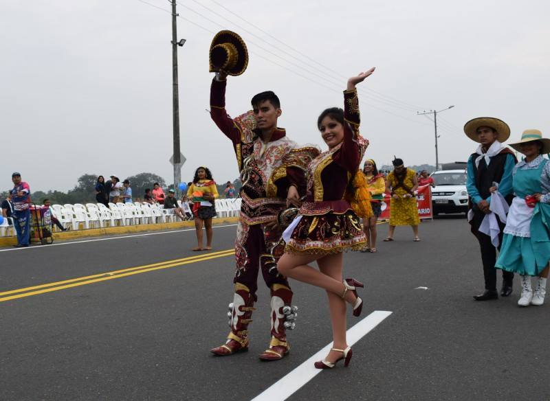 Entre las delegaciones invitadas estuvieron los integrantes de la agrupación Orígenes de mi Perú, que desde el vecino país viajaron hasta Quevedo para deleitar con sus bailes típicos y autóctonos.