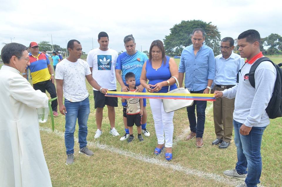 El párroco de la catedral y vicario de la diócesis de Babahoyo, Ramiro Herrera, fue el encargado de bendecir el acto, con una oración y con aspersión de agua bendita por todo el campo de juego.
