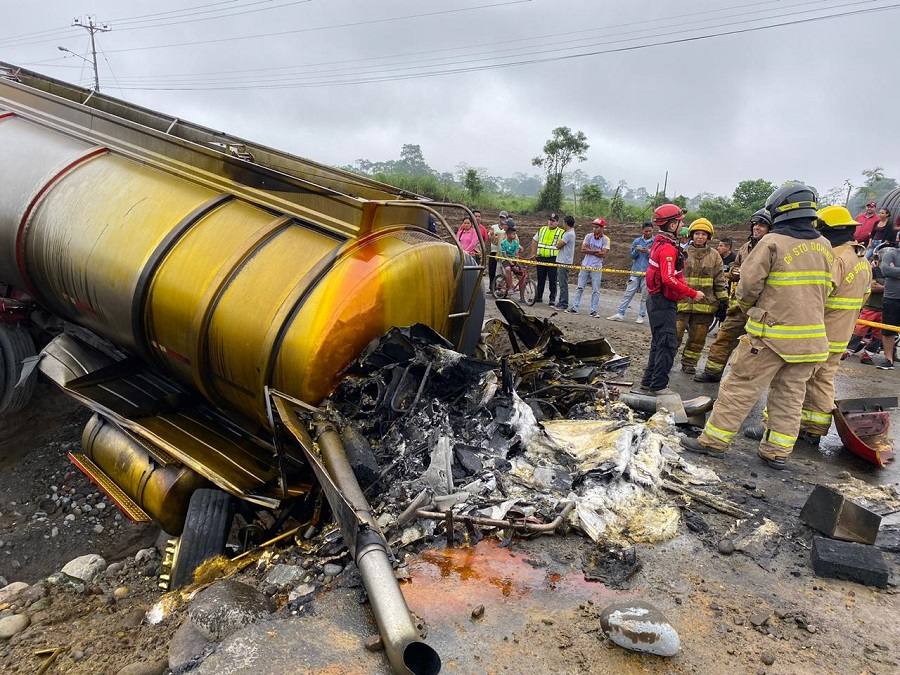 Un tanquero con cargamento de aceite de palma cayó a una zanja y su cabina se incendió. El chofer logró salir y su estado es reservado. Bomberos y agentes de la Comisión de Tránsito del Ecuador (CTE) acudieron al siniestro que ocurrió en el bypass Quito-Quevedo. En esta arteria se trabaja en su ampliación a cuatro carriles.