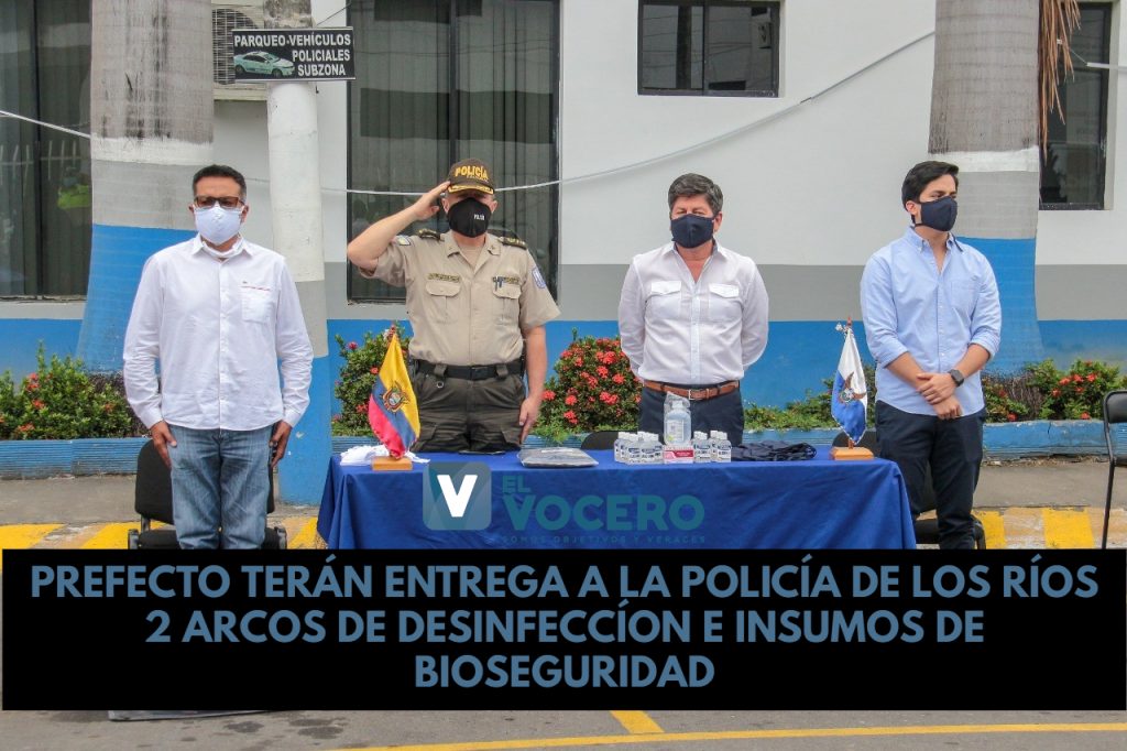 Este jueves, el prefecto Johnny Terán Salcedo entregó a la Policía Nacional acantonada en Babahoyo 2 arcos de desinfección corporal: uno para esta localidad y el otro para Quevedo; así mismo otorgó 2 mil mascarillas reutilizables, 40 trajes de bioseguridad, 2 mil sueros vitamínicos y 1 000 frascos de alcohol gel.