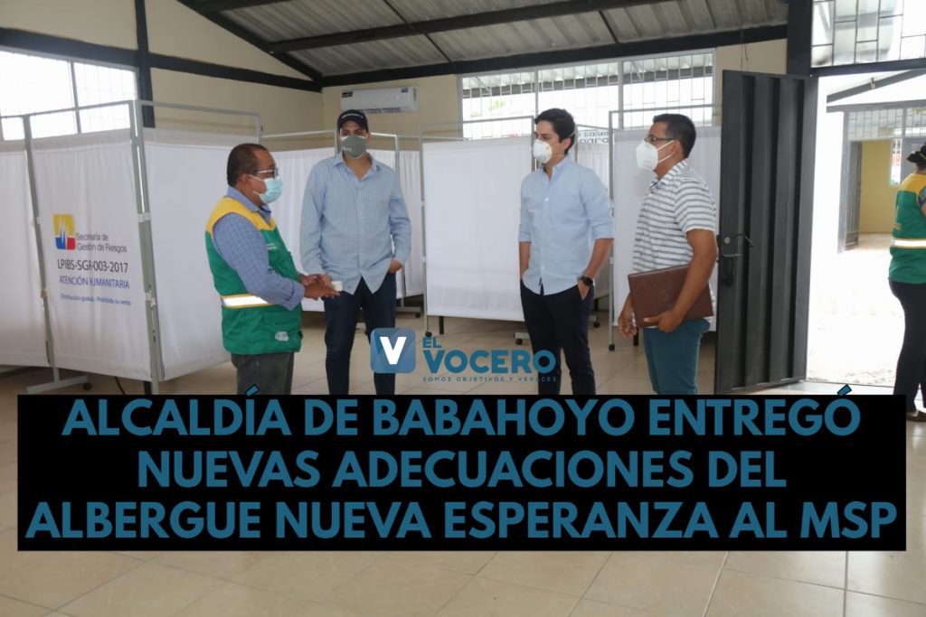 Con el propósito de brindar un mejor servicio a la ciudadanía, y usar la capacidad del edificio al 100%. La Alcaldía de Babahoyo realizó la entrega de nuevas adecuaciones en las instalaciones del albergue Nueva Esperanza al MSP, cuya finalidad primordial será atender a pacientes con coronavirus en menor complejidad.