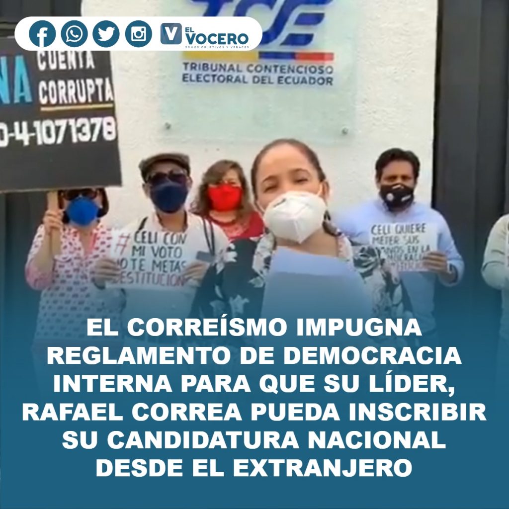 El movimiento correísta Fuerza Compromiso Social presentó un recurso electoral en el Tribunal Contencioso Electoral (TCE) con la pretensión de que su principal precandidato a la Vicepresidencia de la República, el exmandatario, Rafael Correa pueda inscribir su candidatura en el exterior para participar en las elecciones de binomio presidencial, asambleístas y parlamentarios andinos, previstas para el 7 de febrero del 2021.