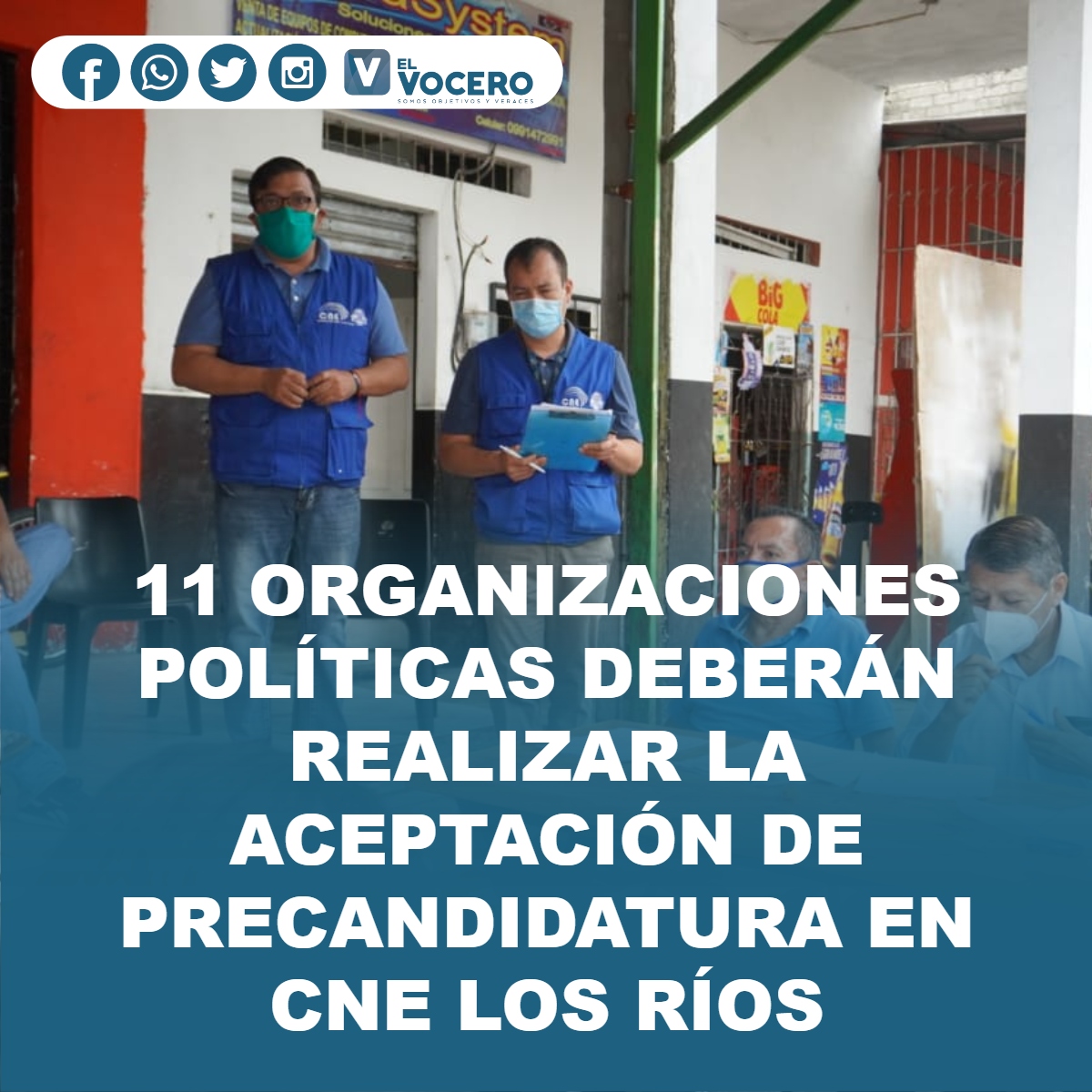 De cara a las Elecciones Generales 2021, las 11 organizaciones políticas que realizaron sus elecciones primarias con veeduría de la Delegación Provincial Electoral de Los Ríos, para la designación de sus representantes a las Elecciones Generales 2021, deberá formalizar la aceptación de las precandidaturas en el órgano electoral, en un acto público, expreso, indelegable ypersonalísimo.