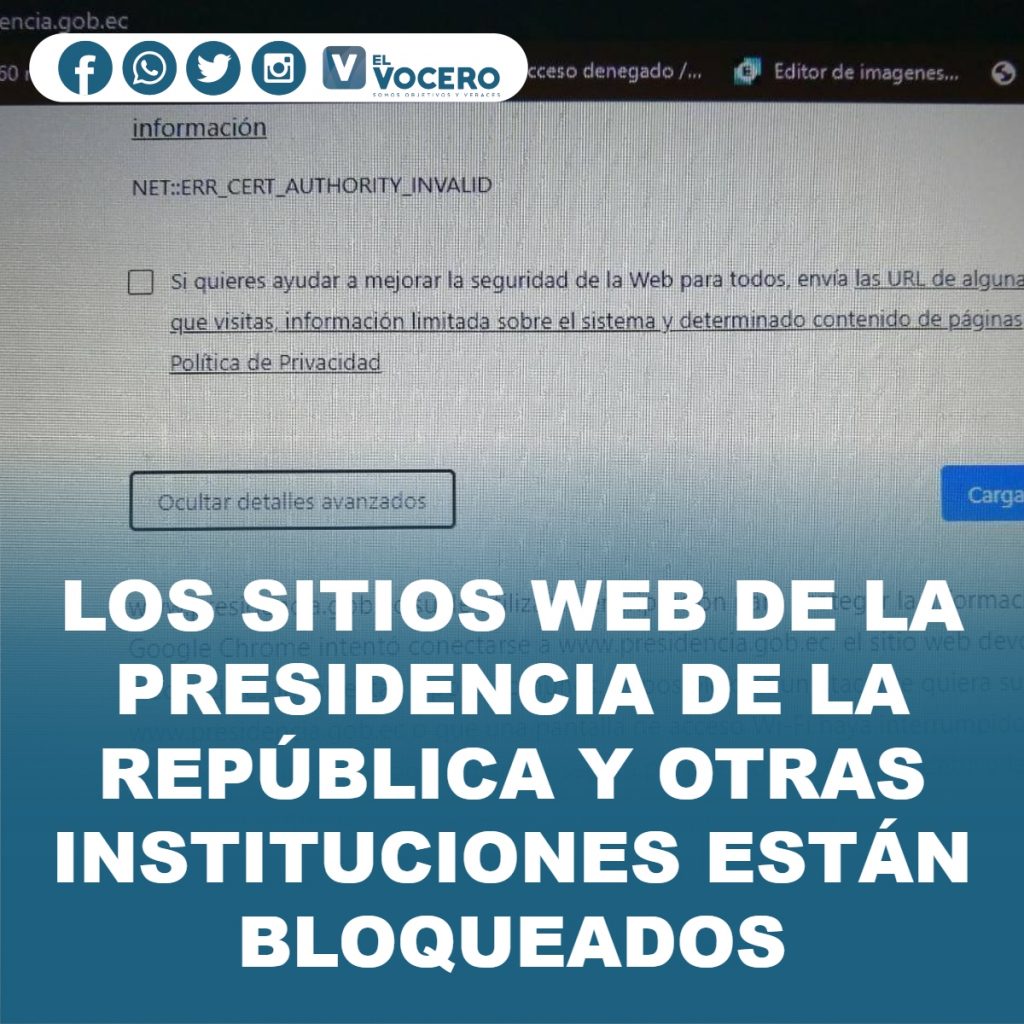 Esta mañana, la página web de la Presidencia de la República y de otras instituciones públicas permanecía bloqueado y, al momento de buscar un ingreso a través de «Configuración Avanzada», los buscadores señalaron que es posible que un atacante quiera suplantar a www.presidencia.gob.ec o que una pantalla de acceso Wi-Fi haya interrumpido la conexión.