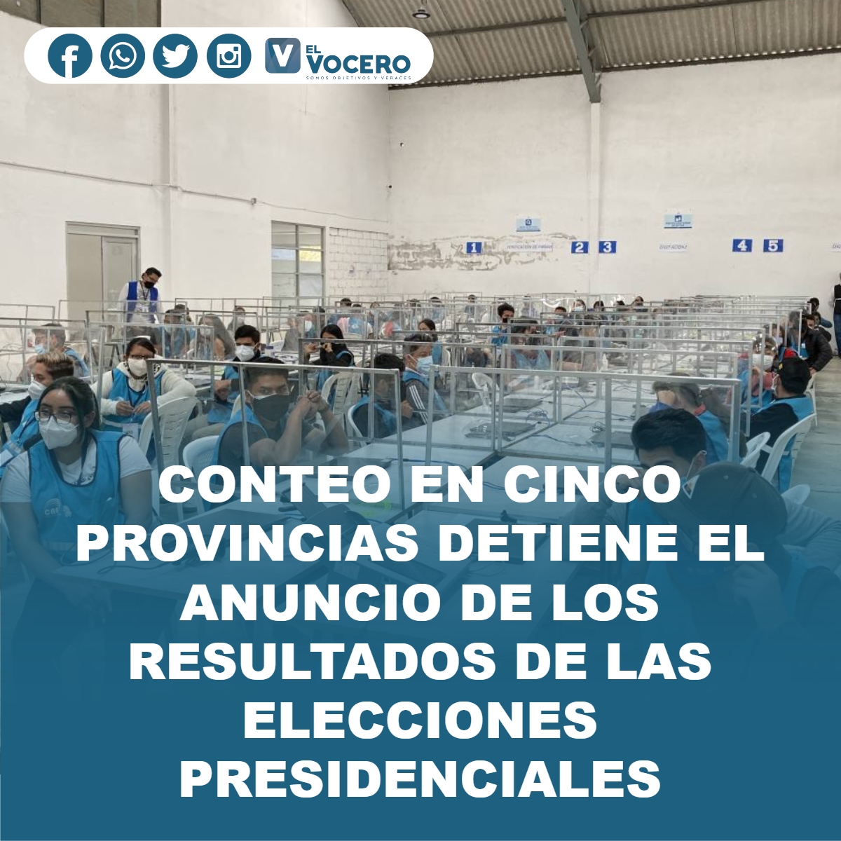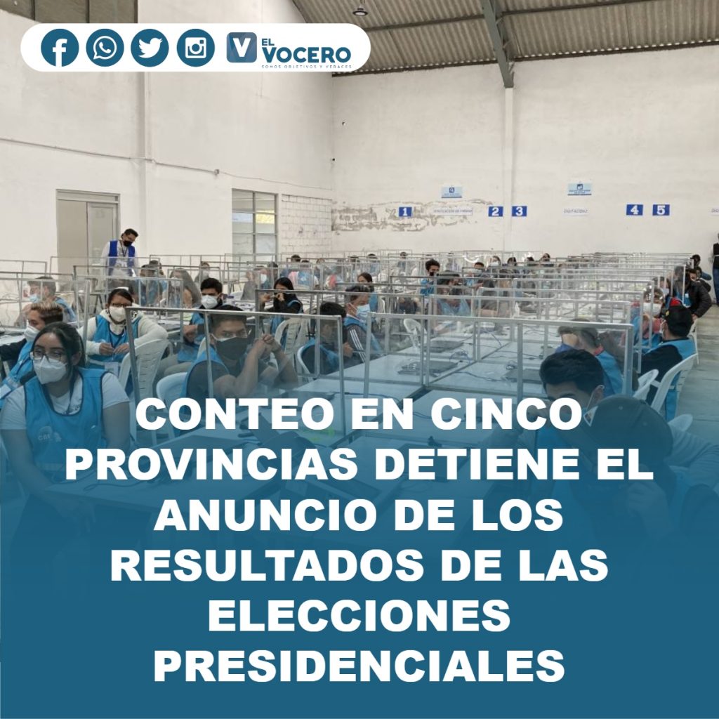 En 19 de las 24 provincias había concluido el escrutinio de actas de la dignidad de presidente de la República, de acuerdo con el sistema de información de los resultados del Consejo Nacional Electoral (CNE), siendo las actas de escrutinio con inconsistencias de las cinco restantes las que definirán cuál será el candidato que pase a la segunda vuelta electoral, en el marco de las elecciones nacionales del 2021.