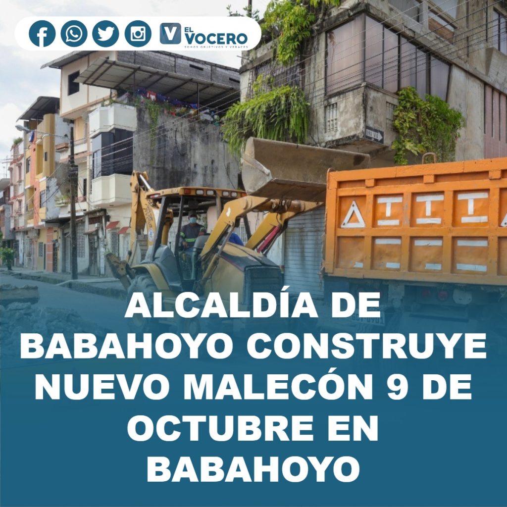 Con el objetivo de continuar con obras que mejoran el ornato de la capital riosense y contribuyen al desarrollo del cantón, la Municipalidad construye el nuevo malecón 9 de Octubre desde la planta de CNEL ubicada a la altura de la calle 18 de Mayo hasta el puente colgante que conduce a la parroquia Barreiro.