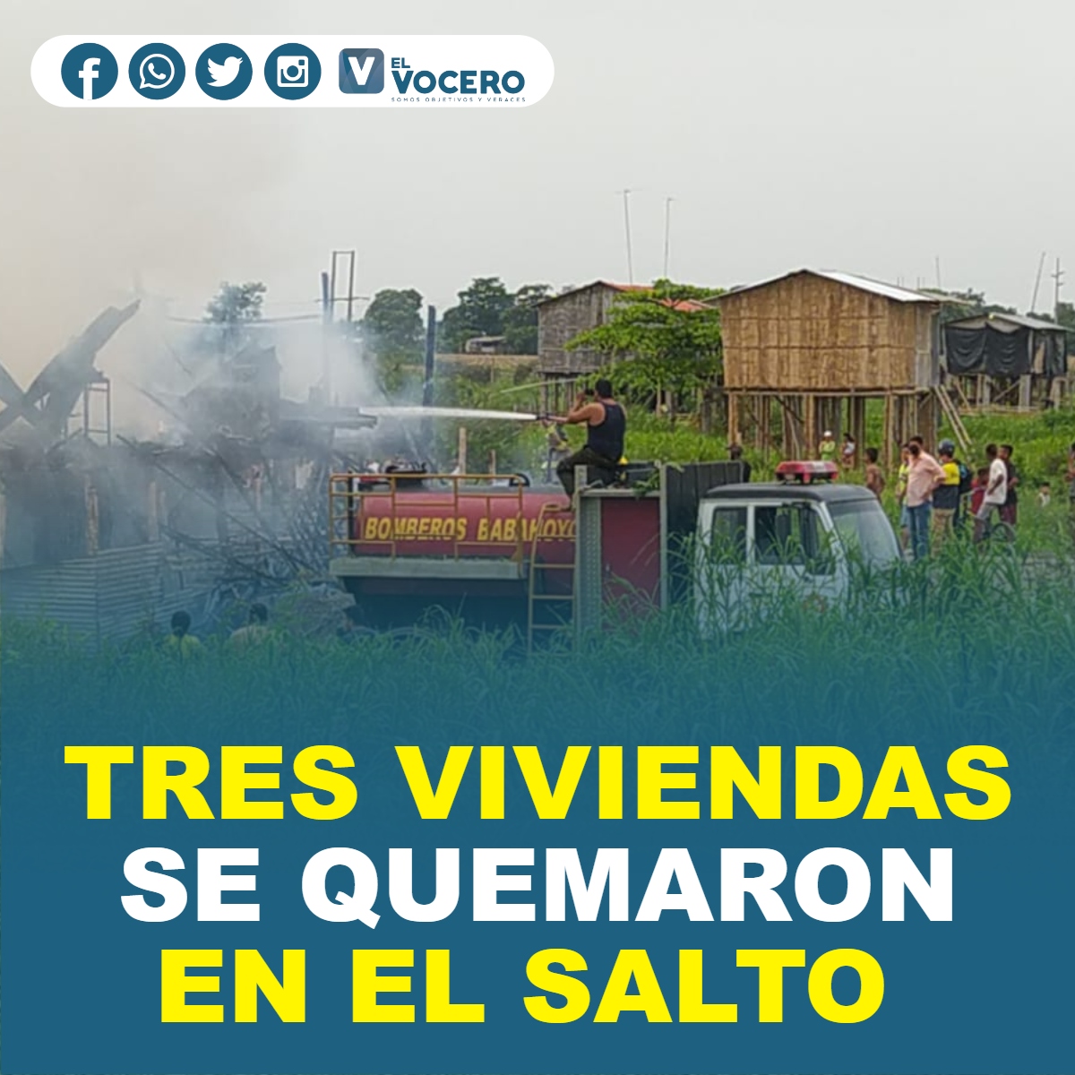 A esta hora personal del Cuerpo de Bomberos de Babahoyo, se encuentra trabajando en sofocar las llamas de un incendio que se registró en la parroquia El Salto de Babahoyo, donde al menos tres viviendas de madera y caña fueron consumidas por las llamas.