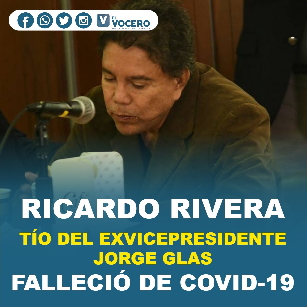 Ricardo Rivera, tío del exvicepresidente Jorge Glas, falleció la madrugada del 15 de enero de 2022 en Guayaquil a causa del COVID-19, así lo indicó su abogado Aníbal Quinde.