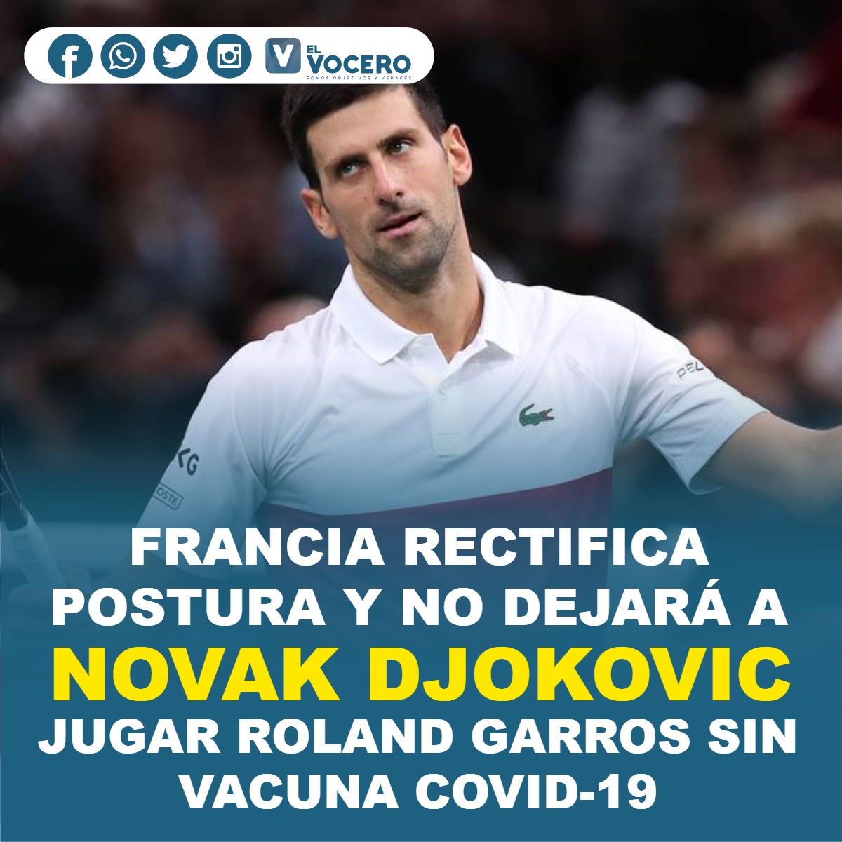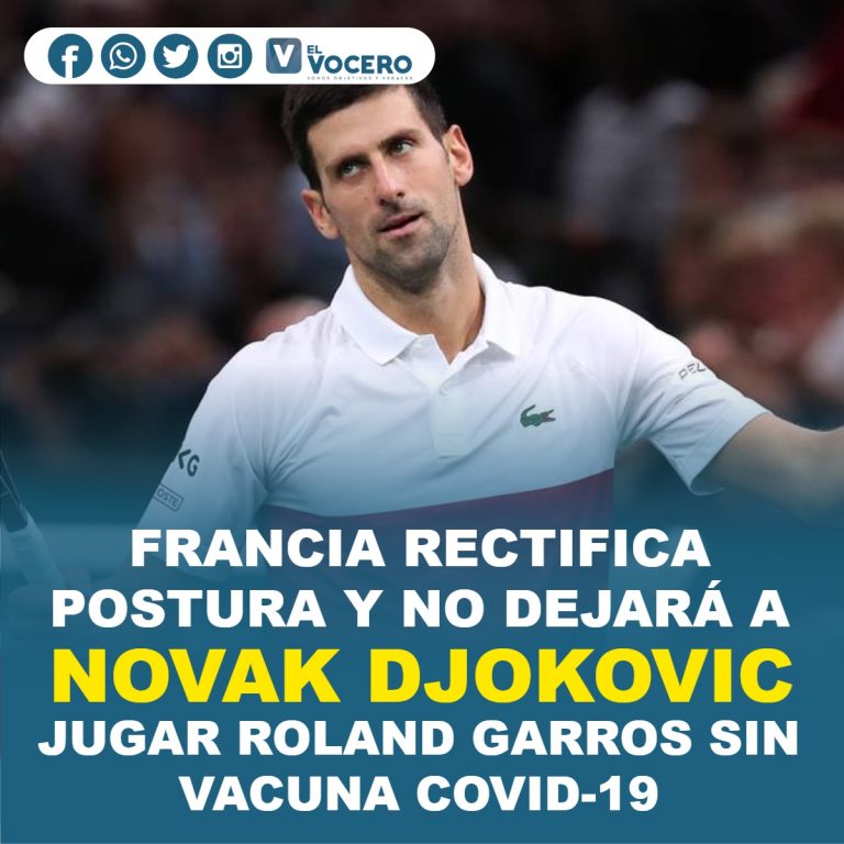 Home»Vocero Deportivo»Internacionales»FRANCIA RECTIFICA POSTURA Y NO DEJARÁ A NOVAK DJOKOVIC JUGAR ROLAND GARROS SIN VACUNA COVID-19