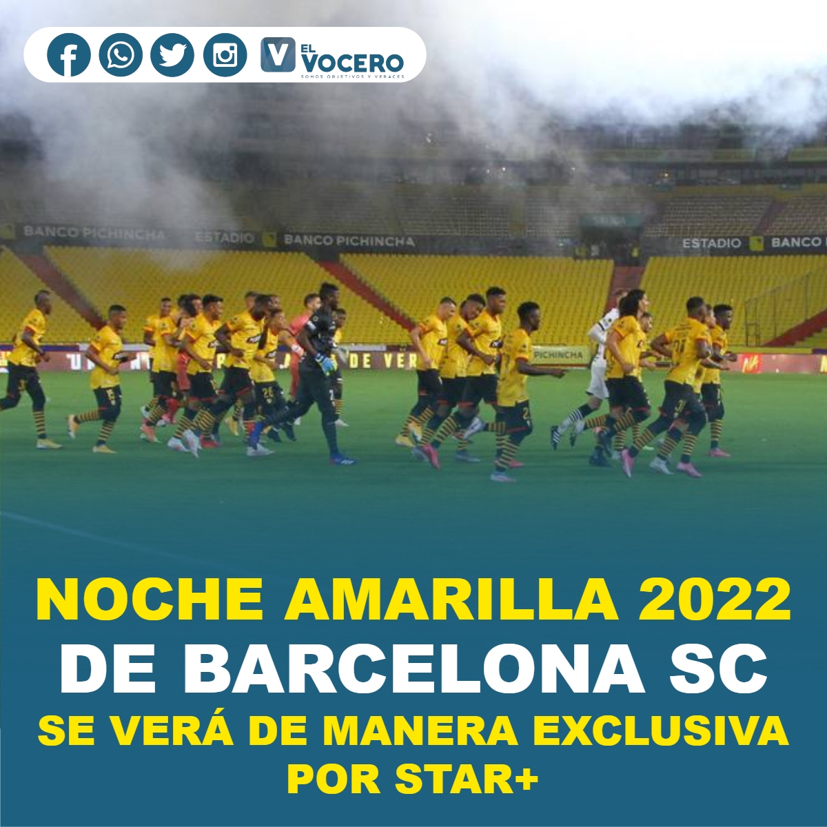 La Noche Amarilla 2022, evento en el que Barcelona Sporting Club presentará a la plantilla que afrontará el campeonato ecuatoriano, la Copa Libertadores y la Copa Ecuador en la campaña entrante, se verá de manera exclusiva por la plataforma Star+.