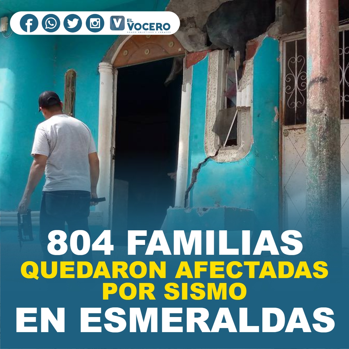 En Esmeraldas hay 804 familias damnificadas, 196 casas afectadas y 6 bienes públicos con daños por el sismo.