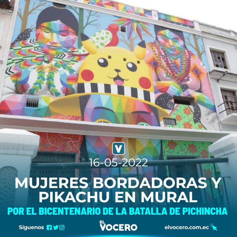 Sobre la fachada de un antiguo cine, la obra de Okuda, conocido por sus piezas artísticas con figuras de patrones geométricos multicolor, rinde homenaje a las mujeres bordadoras de la comuna quiteña de Llano Grande, de la parroquia Calderón, cuyos bordados han sido declarados patrimonio cultural nacional de Ecuador.