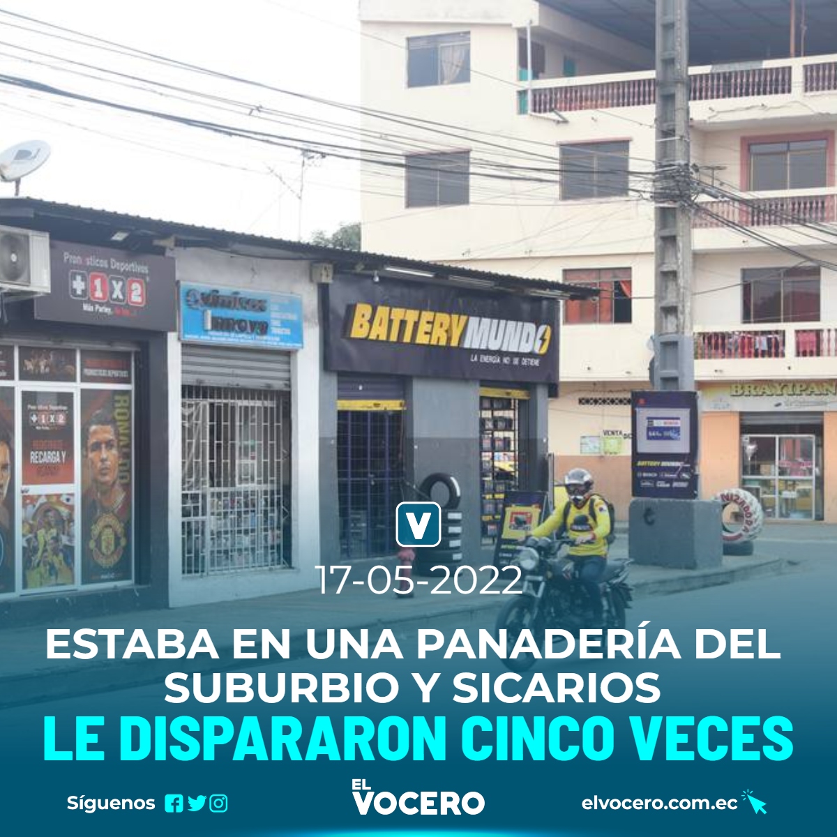 En la 38 y Portete, en el suburbio de Guayaquil, sicarios en motocicleta balearon a Jorge H. C., de 30 años. Ocurrió a las 21:00 del lunes 16 de mayo cuando la víctima estaba afuera de una panadería del sector.