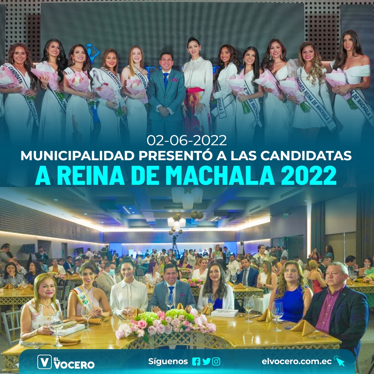 En el Hotel Oro Verde, se realizó la presentación oficial de las 10 candidatas que participarán para ganar la corona en el certamen Reina de Machala 2022. El evento se cumplió, luego de dar a conocer públicamente, la agenda de festividades que la ciudad ha preparado por los 198 años de cantonización.